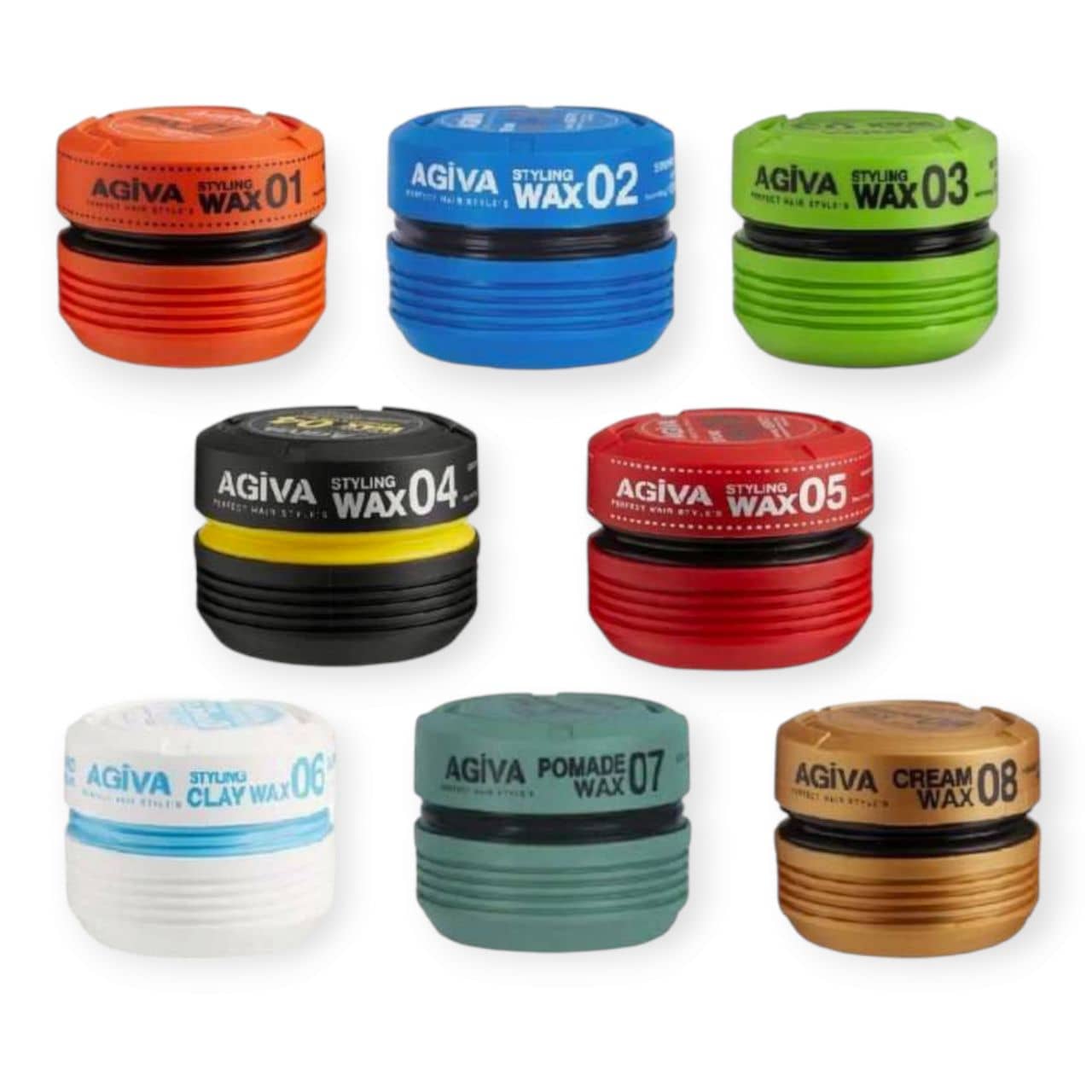 •  agiva styling wax 05: به صورت ژل چسبی است. مو را خشک و براق میکند، همانند چسب مو قدرت نگه دارندگی بالایی دارد. برای بافت مو و نگه داری طولانی حالت مو استفاده میشود.